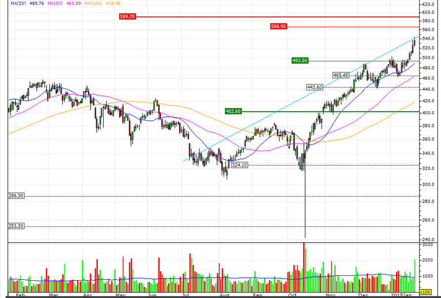 Canal ascendente (mais de 12 meses), testa 2 resistências móveis em simultâneo - MM50 e MM100 (clarificação no curto prazo). Overbought num crescendo de volume.