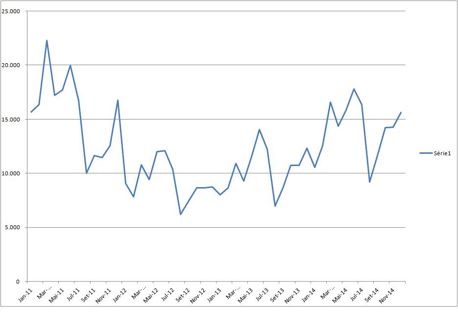 O consumo no geral tem vindo a crescer. Mas deixo o gráfico do mercado automóvel (ligeiros porque representa melhor o poder de compra das famílias) desde 2011. uma olhada rápida mostra que desde o início de 2013 tem sido sempre a subir.