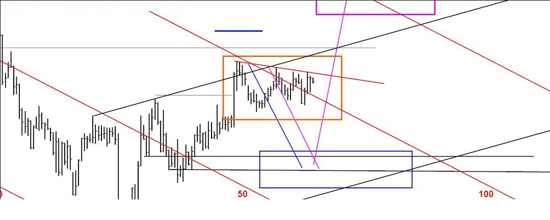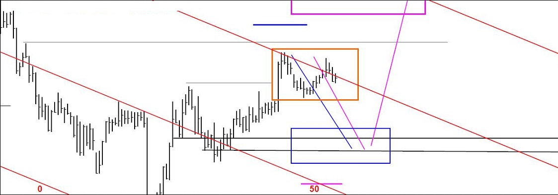 Para a próxima semana/15 dias temos a anterior oportunidade especulativa e as que estão descritas no gráfico de hoje: uma venda para aproveitar a ida do preço à caixa azul e uma vez aí chegado uma compra para uma ida à caixa rosa.