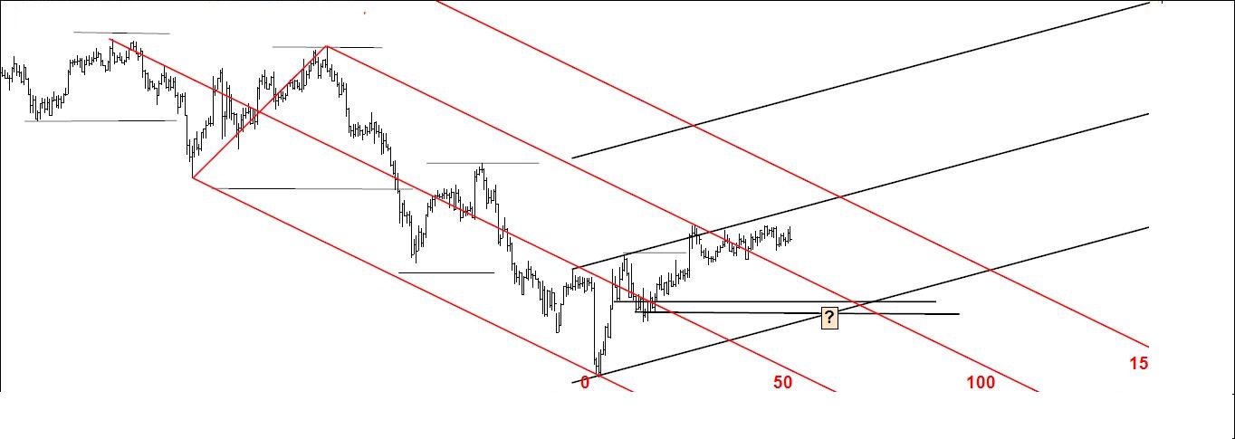 A tua questão quanto à posição da stoploss talvez derive da circunstância de não ser visível o preço nem o activo em causa (o que posso dizer é que cheira a petróleo), para além de que o gráfico exibe muita informação que eu próprio não gosto de usar (quanto mais olhar se para a cotação do passado,mais "medo" se pode ter do futuro e isso condiciona logo a abordagem). Mas, num sítio como este, em que apenas é possível a escrita e o desenho, temos de privilegiar a abordagem ao preço o mais abrangente possível. A análise do price action, a que me dedico após a feitura dos desenhos, é pois algo "impossível" de realizar aqui. Ora, é muitas vezes este price action que me vai ditar em concreto o local onde a stoploss será colocada, e não necessariamente uma linha.
