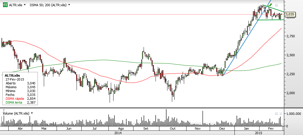 Médias Móveis 50 e 200 - Ascendentes, a MM 200 quase sem declive mas ascendente;