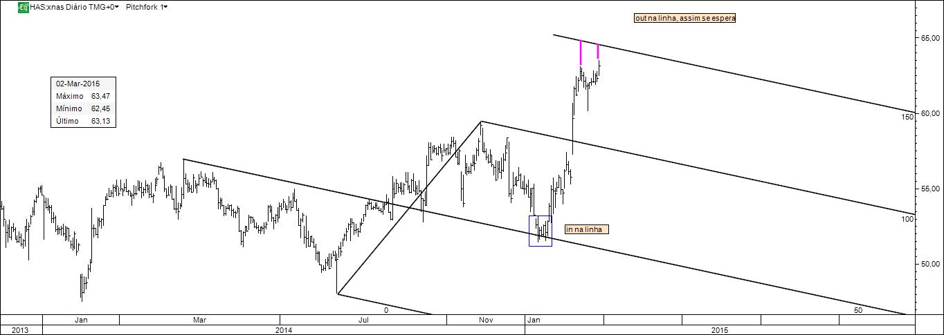 Repara que o inverso também sucede. É caso da has, que está a um "danoninho" de atingir o target; quanto mais o tempo passa, mais o preço desliza à procura de uma linha descendente.