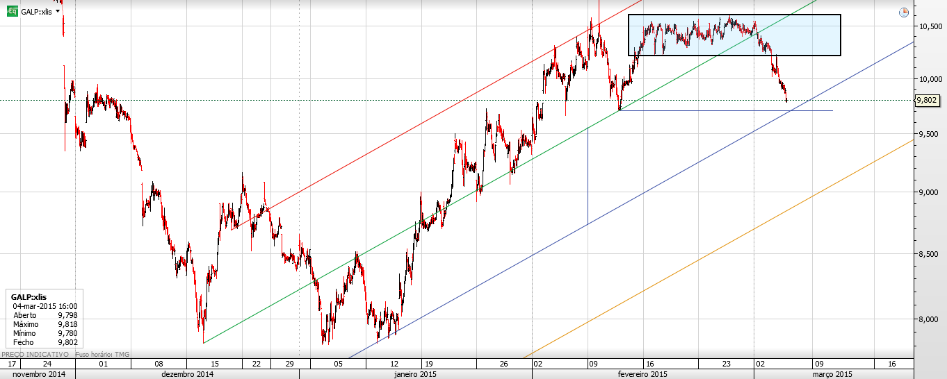 Depois de ter estado a lateralizar e a acumular durante duas semanas a Galp cai, e quando todos estão à espera do ressalto dos 9.70, não poderá a cotação avançar para sul novamente? Veremos...