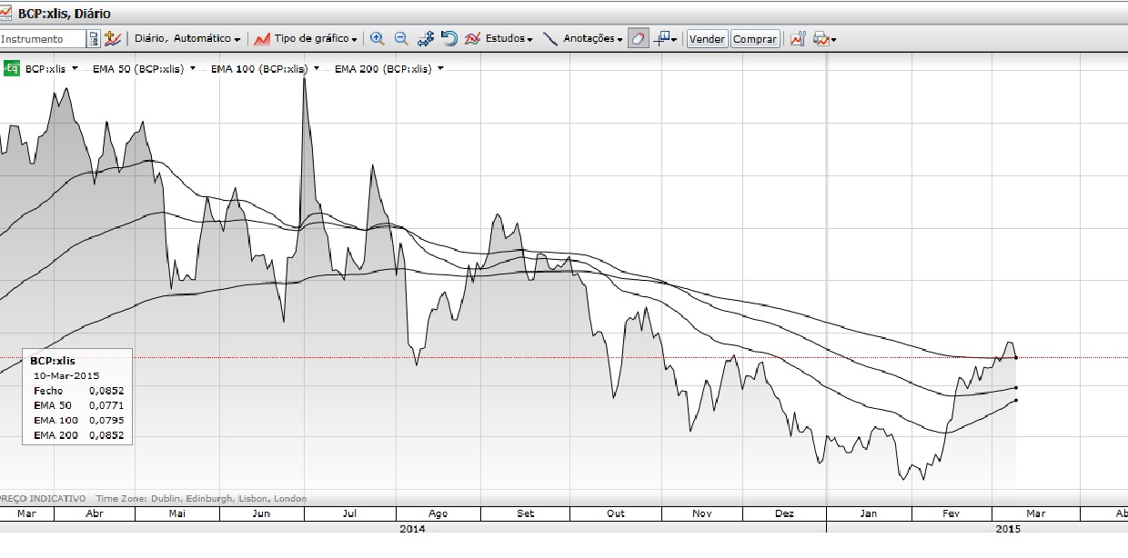 Nao obstante as fortes correccoes nos ultimos dias nos mercados accionistas e nos bancos em particular, reparem como o BCP se aguenta forte, acima das medias moveis de 50,100 e 200 dias. Um excelente pressagio!