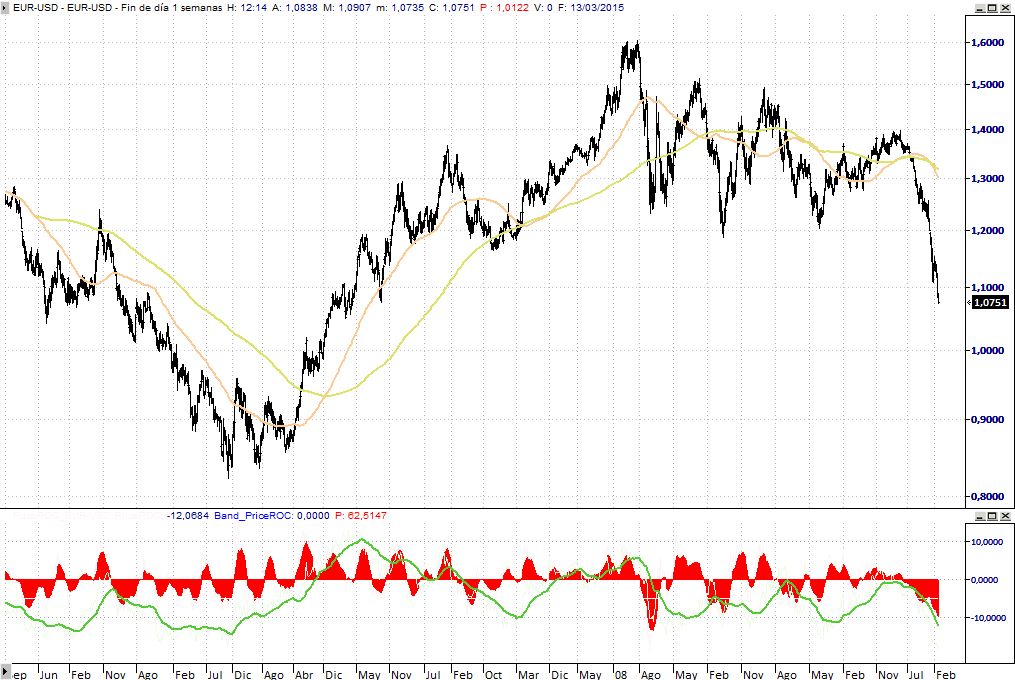 Aplicável a qualquer set temporal, tem como inputs a diferença entre as médias móveis de 12 e de 26 dias (pode-se fazer inter-relações mais curtas geram variações mais acentuadas ou mais alargadas e geram evoluções gráficas mais lentas). Como parte de médias móveis de curto prazo, antecipa a evolução da tendência.