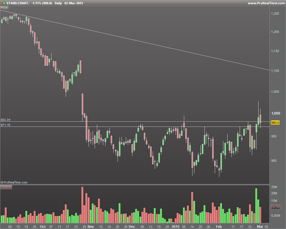 -A última subida de Fev.2015 é feita com descida de volume o que poderá não ser um bom sinal. Contudo encaro isto assim- mesmo sem grande interesse comprador, o interesse vendedor é ainda menor, levando o preço a subir. Imaginem quando o interesse comprador aparecer?