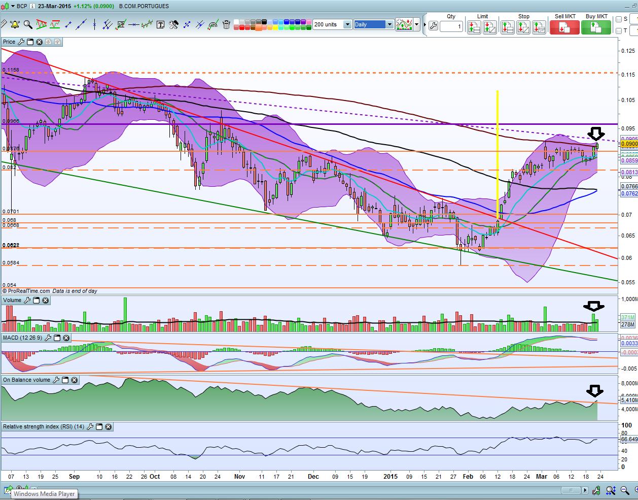 Olhando para o grafico diario vejo que o RSI +/- junto do dia 15 de Fevereiro apesar de se encontrar bastante esticado ainda teve força para overbought quando a cotação superou a pequena resistência dos 0,073, o mesmo aconteceu no +/- dia 3 de março quando finalmente bateu outra resistencia dos 0,084 portanto acredito que o mesmo se possa passar agora na próxima resistência e só depois consolidar um pouco, MACD está como está e o volume bastante interessante. Portanto nao existem sinais claros e o risco torna-se demasiado elevado, existem alguns de que pode surgir uma correcção mas o inverso tambem acontece se o PSI continuar a puxar e o BCP passar a resistencia, logo eu achar que neste momento é uma aposta de casino e ariscada. Estou dentro mas se estivesse fora certamente que não iria entrar nesta altura.
