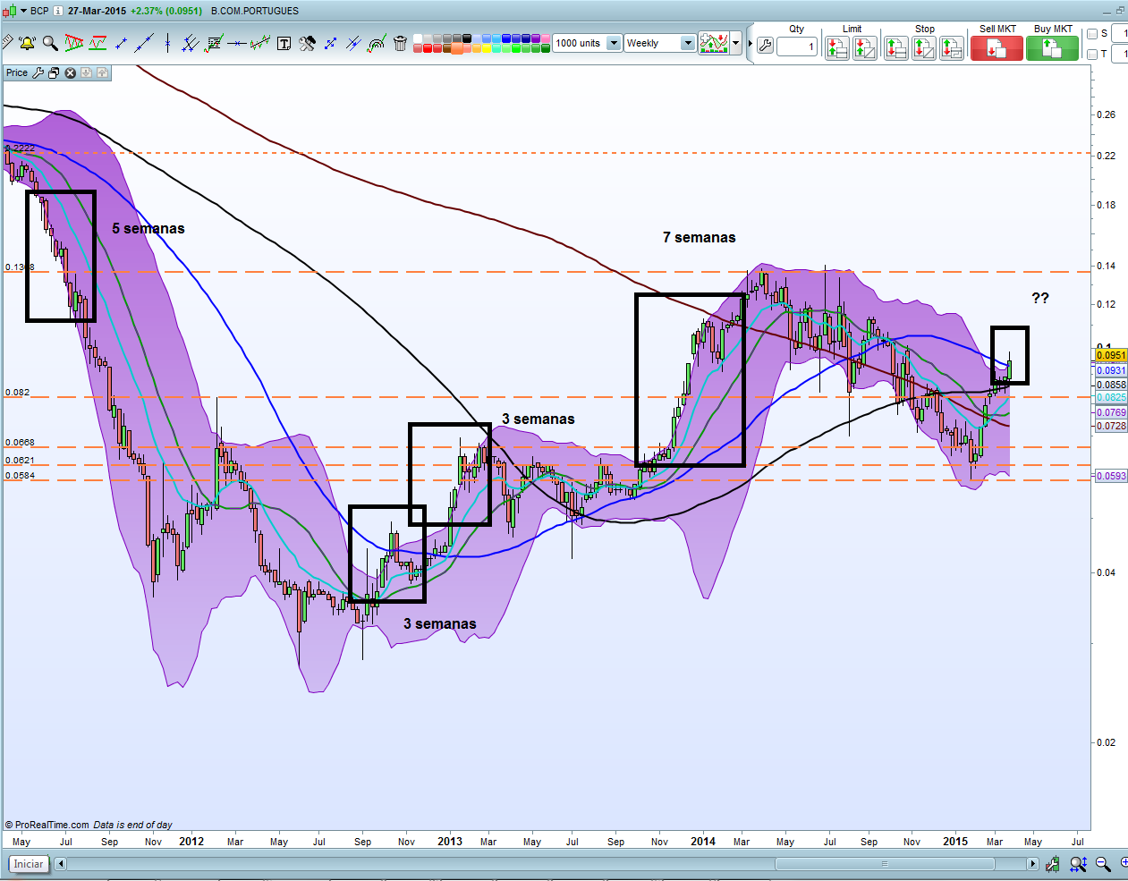 Então, e se percebi correctamente, a partir do momento que sai fora das bandas é altura certa para entrar porque inicia movimentos ascendentes, ficando como incógnita durante quanto tempo se manterá fora da banda. Por outro lado, a maioria dos comentários aponta para ficar de fora enquanto não for quebrada a barreira dos 0.10€.