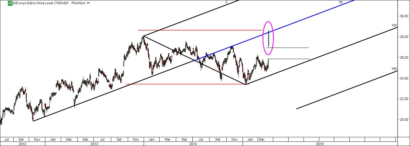 Em relação à GE, este ultimo movimento rompeu uma forte resistência. Considerando o fork desenhado, as perspectivas são boas para o médio/longo prazo. No curto prazo, e dada a presença da median line (azul), antevê-se uma certa resistência. Há igualmente um gap a considerar.