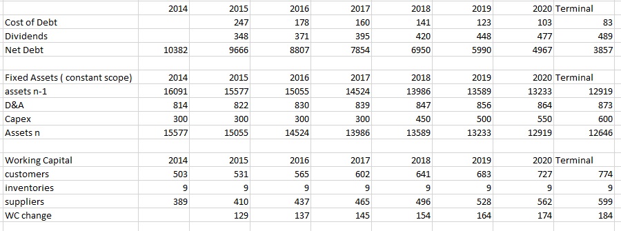 passando o valor em perpetuidade para 2,5% em ambas as metricas, o fundo de maneio futuro foi calculado tendo em conta as vendas e assumindo a relação atual entre clientes inventarios e fornecedores