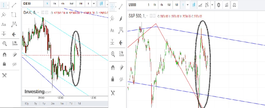 gráfico de 5 min do DAX e de 1 min do SP500 - olha as velas que ambos os indices fizeram em questão de 2-3 min, aquando da saída do relatório da FED, precisamente por volta das 19h15 (assinalei as velas com elipses), que por sinal até nem é bom para os mercados: