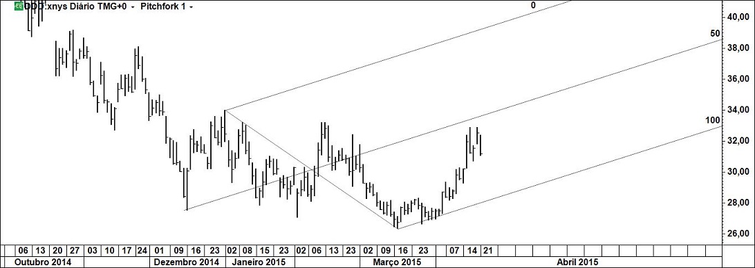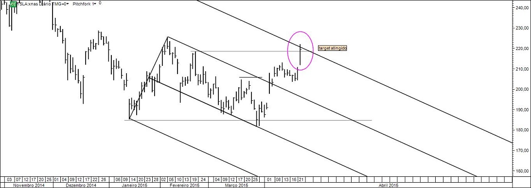 Pelo gráfico que agora apresento falta cerca de 4% para o target (RL). Necessariamente subindo a stop profit e ponderando seriamente fechar a posição: as linhas podem ser muito interessantes, mas o que importa é alcançar o desiderato do FI Alquimia 2015 indo de resultado em resultado.