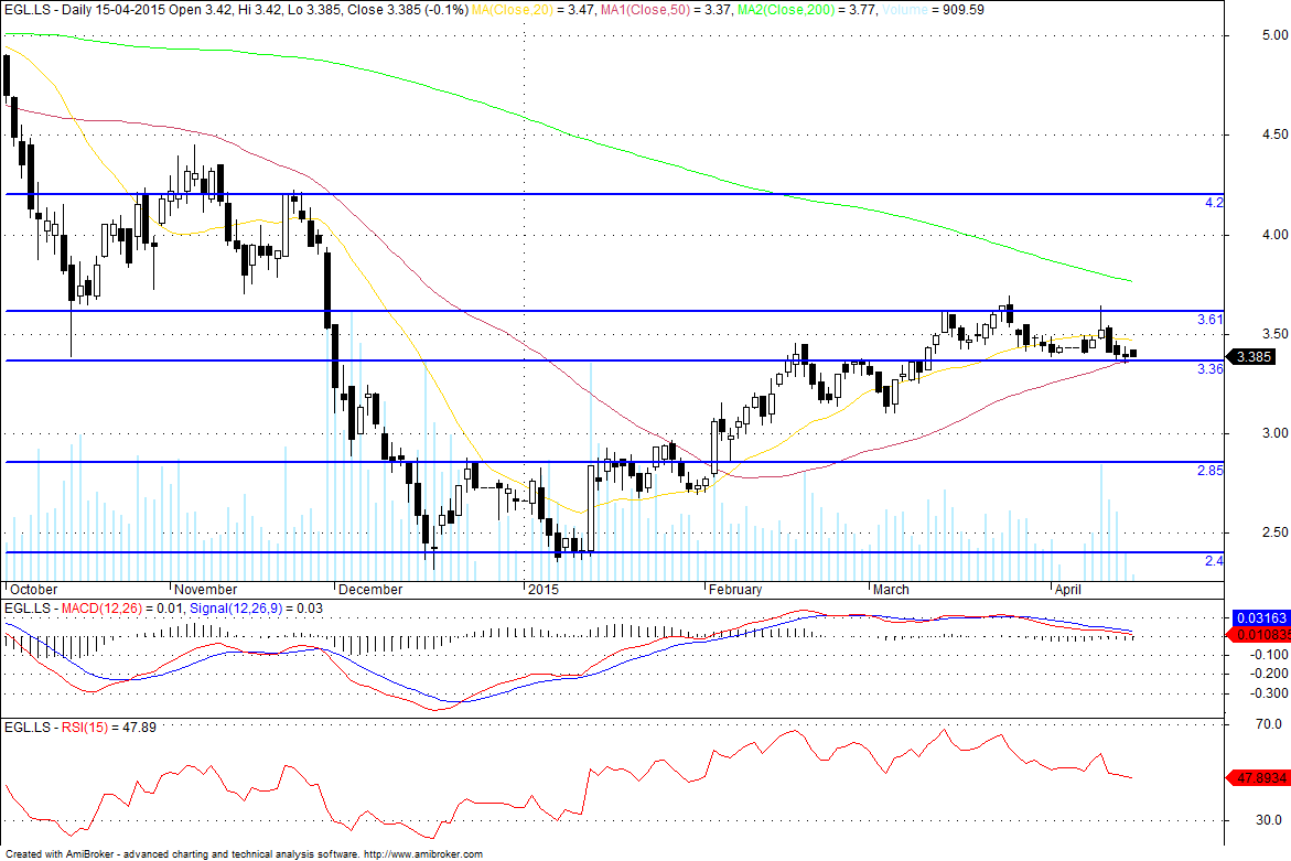 Até à data apresenta características de um movimento corretivo ABC à tendência de alta (diário), enquanto se encontrar dentro do canal descendente, com um cluster entre os € 3,374 e os € 3,327.