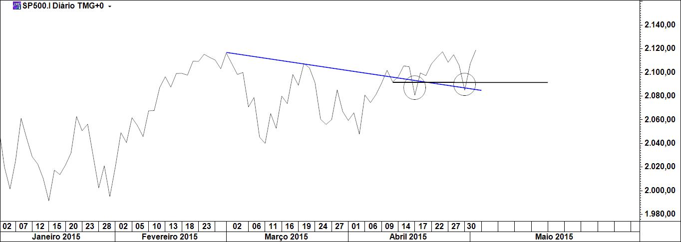 Exemplo: sp500. Pode voltar abaixo da linha azul? Pode. Pode continuar por cima dela? Pode. Pode testá-la? Pode. Actuemos pois em conformidade.
