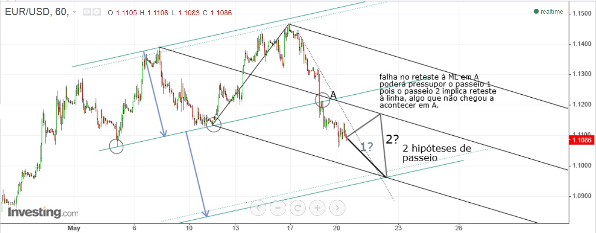 aqui vai a 1ª fork ascendente que aqui postei inicialmente há 2-3 semanas (gráfico 1)qd o preço ainda ia a subir pelos 1,07-1,08 e que tem, até agora, uma coerência mt boa com o preço. nunca deixei de olhar para esta fork, mesmo qd há 2-3 dias já estava a olhar para o curto na tal fork descendente "what if" - nesta, o preço estava a bater na ML. nota que neste momento está-se a debater com a linha inferior (gráfico 2).