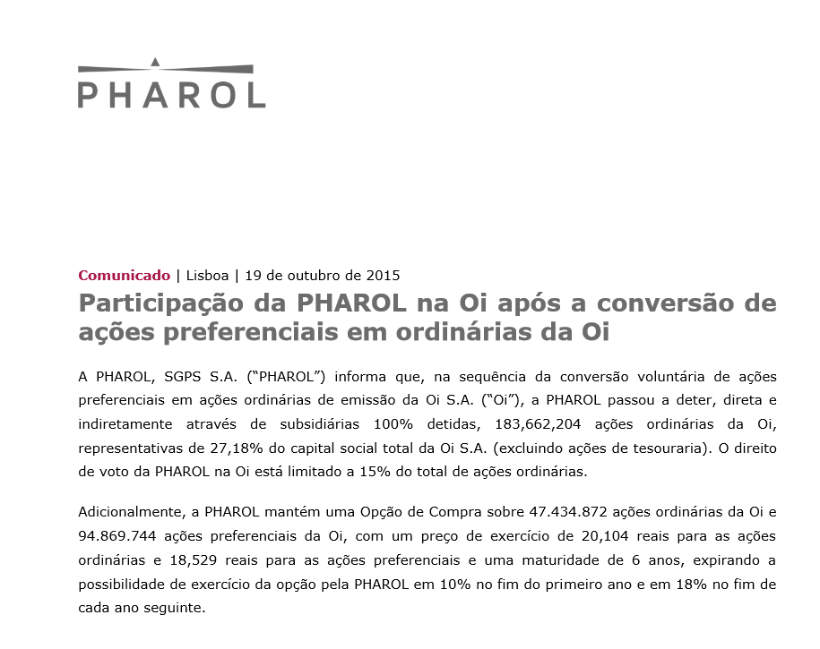 Com a fusão seriam trocadas x accoes oi por accoes PT. atualmente, não irao ser trocadas accoes e como tal a PHAROL ( e assim?!) ficara com a participaçao de 27,5 na OI + 900 milhoes rioforte + Custos de estrutura de se manter + uns quantos abutres administradores!