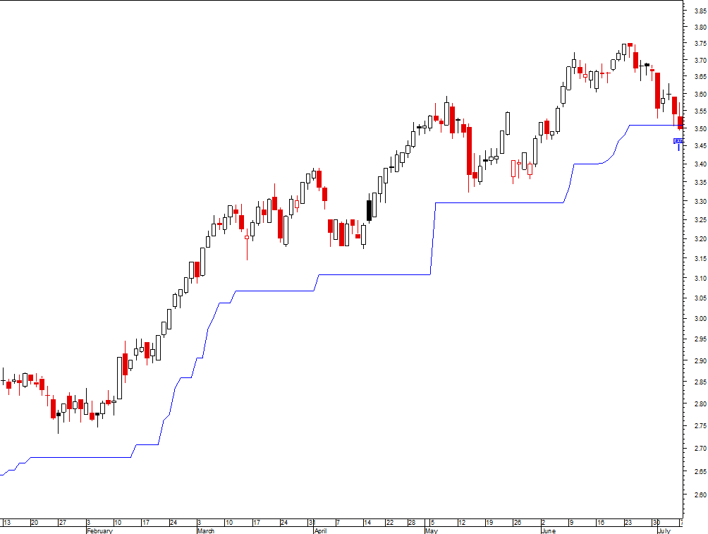 resumidamente, acompanha as subidas a uma distância dada pela volatilidade; como se percebe facilmente, quando a acção lateraliza ou cai, o valor nunca baixa, (nem sobe)
