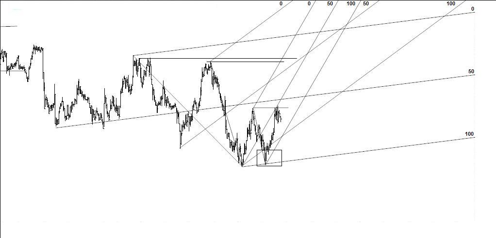 o resultado é uma aparente teia de aranha, mas que permite identificar uma confluência de linhas na zona do eventual pivot 6A que poderá muito naturalmente servir de suporte, pelo menos numa 1ª fase, caso o preço aí chegue, pelo que será zona para largar um pouco de carga curta (1/3 - 1/2). por outro lado, supondo-se que o eventual pivot 5 o seja, de facto (a confluência de linhas logo acima terá, porventura, servido de barreira à subida do preço, e tb a linha 2ml 3-4 passa mais acima.), e usando-se a medida da distância que o preço percorreu na última descida 3 - 4, chega-se à mesma zona.