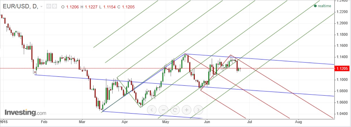 p.s.s. um último aspecto em relação à fork ascendente (verde) no diário: outrora muito útil na previsão da subida que ocorreu a partir do mínimo absoluto, ainda "apanhou" o preço na sua 1ª wl, permitindo observar, por essa altura, uma extrema fraqueza do mesmo nas suas várias tentativas em vão de atingir a lmlh. parecendo cada vez mais claro que, no horizonte temporal deste gráfico diário, a tendência neste momento será, no mínimo, de lateralização, facto que me sugere serem actualmente mais relevantes as forks encarnada e azul, ainda assim, deixei estar a verde por eventualmente poder ser um obstáculo à descida do preço na sua 2ª wl. acredito, no entanto, que tal não venha a suceder, e que o preço se encaminhe para a referida intersecção na zona dos 1,08.