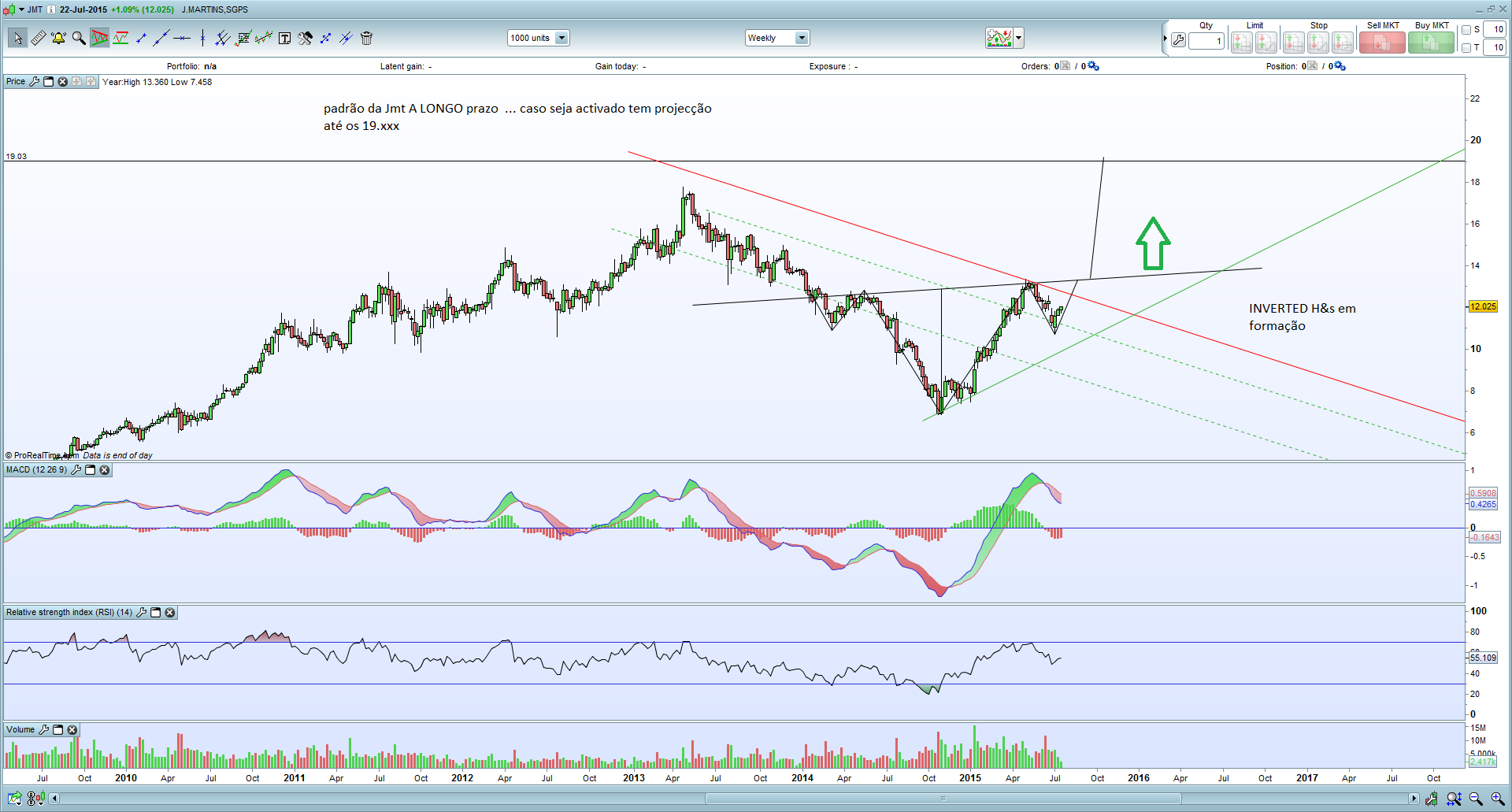 E segue serena a JMT. Parece estar a consolidar nestes valores, sobe um dia, volta a descer, cai um dia, volta a subir, sem grande volume, nada de especial, muito provavelmente um movimento saudável de uma ação que subiu bastante nos últimos meses. Provavelmente até nem será um mau range de preços para proceder a um reforço da posição para quem está dentro há algum tempo(estou a ponderar fazê-lo). A nível técnico penso que mantém a longo/médio prazo o seu caminho de alta.