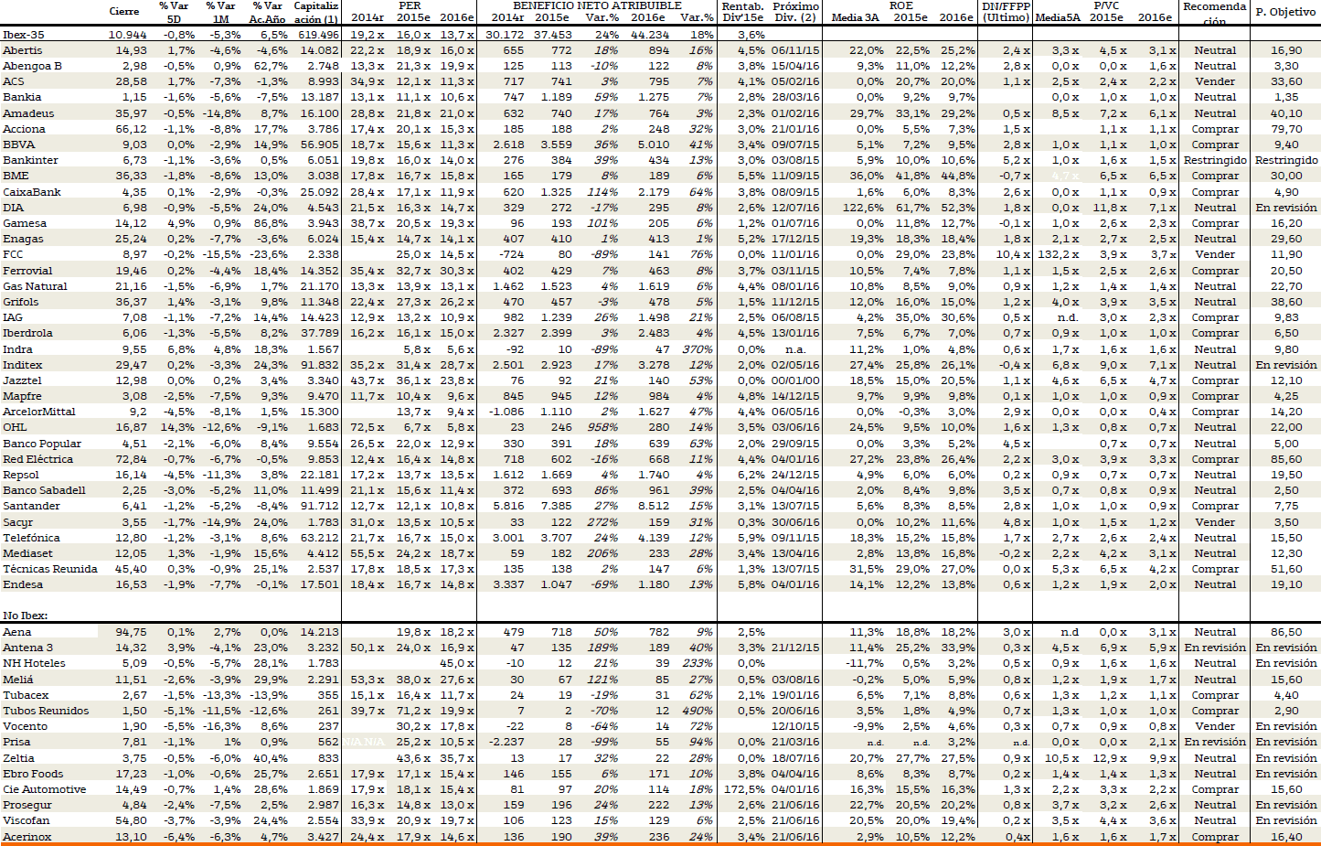 Finalmente, tabela+gráfico do IBEX35 e de algumas ações selecionadas. Dos mercados mais previsíveis na Eurozona (ao contrário do PSI).
