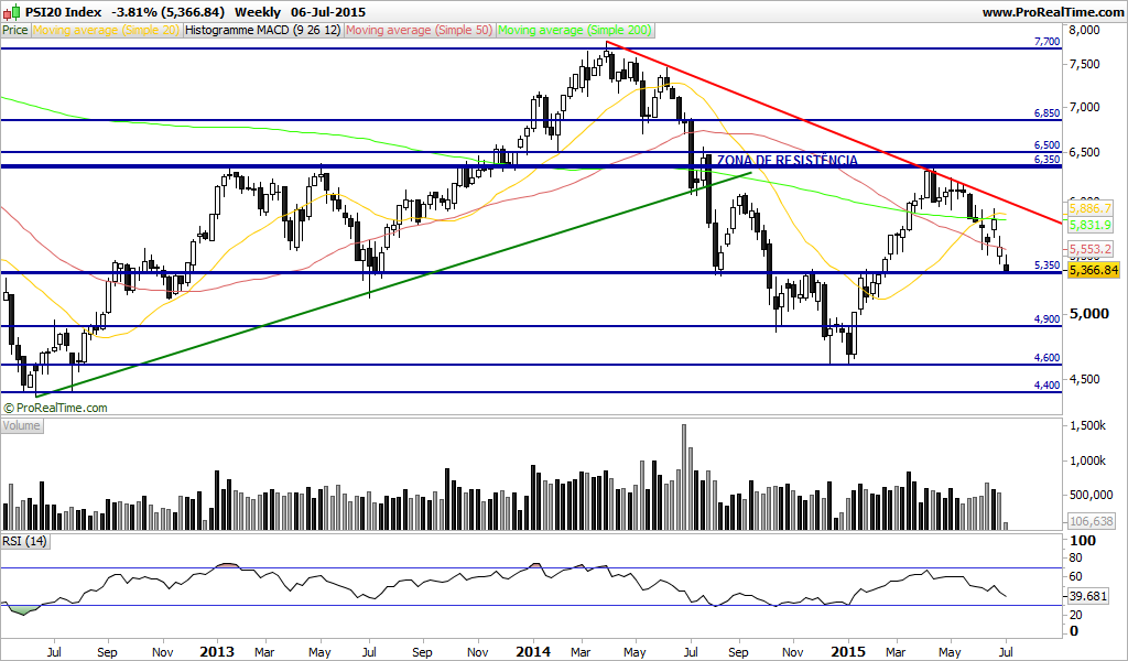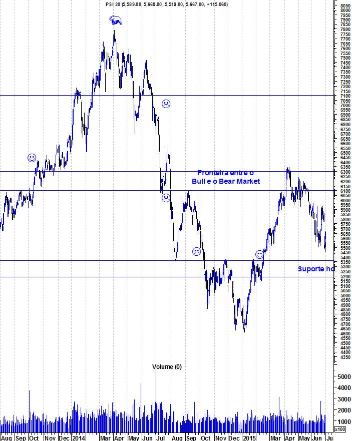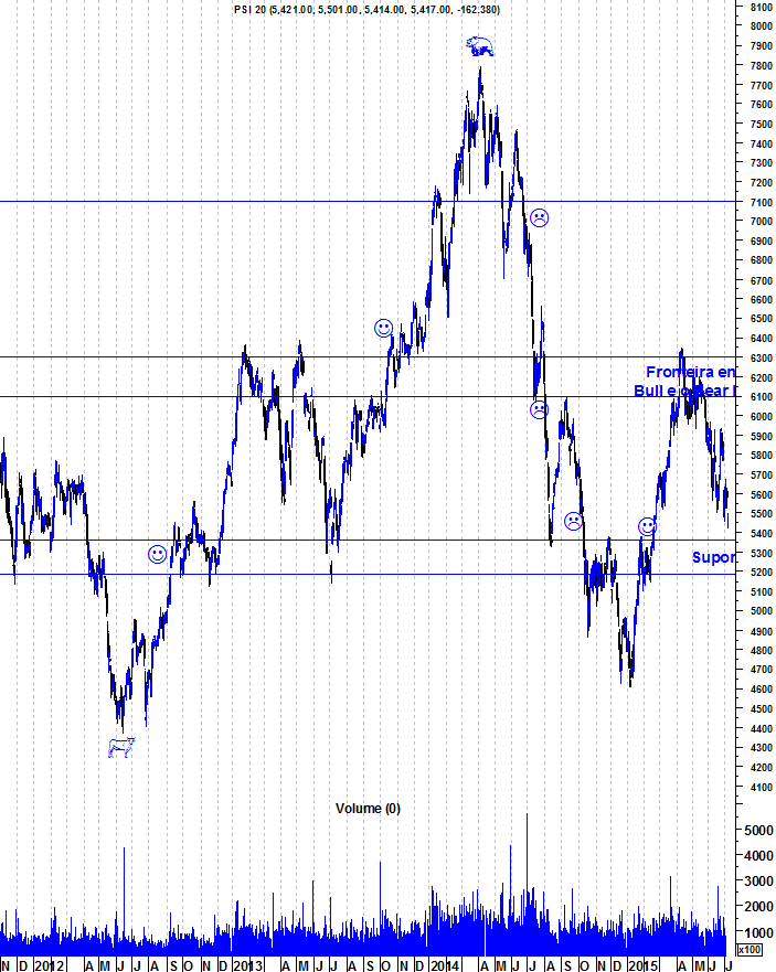 Aqui ficam os gráficos actualizados do PSI, numa altura em que o índice está cada vez mais afastado da fronteira entre o Bear e o Bull Market e cada vez mais perto do seu suporte.