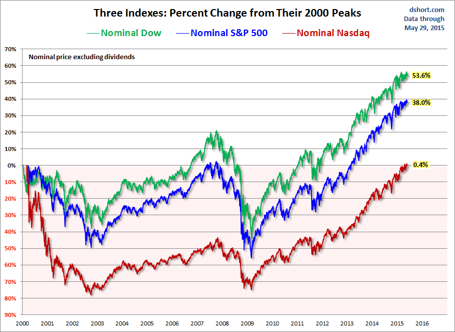 9) A propalada valorização do S&P500, do nasdaq e do Dow desde os máximos de 2000, é uma falácia se descontarmos a inflação (ver gráfico)