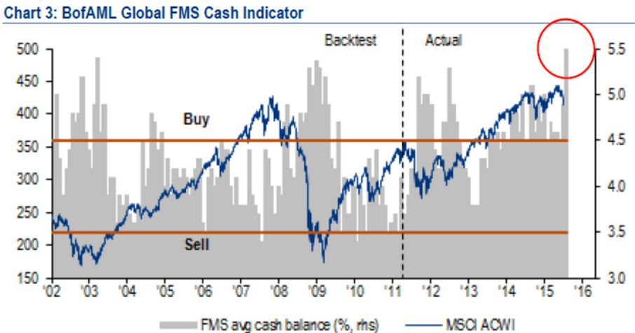Desde Dezembro de 2008 que os gestores de fundos não acumulavam tanta liquidez (já não chegava a acumulação de liquidez na Banca em recordes de 2005, e o crescimento da massa monetária fruto do FED e agora dos 60 mil milhões/mês do BCE e do BOJ), com níveis de liquidez que ultrapassaram ontem os 5,8%, quando a médio do ano passado andou nos 2,4% (existem fundos que têm normalmente liquidez negativa - por terem posições alavancadas, a liquidez é anulada).