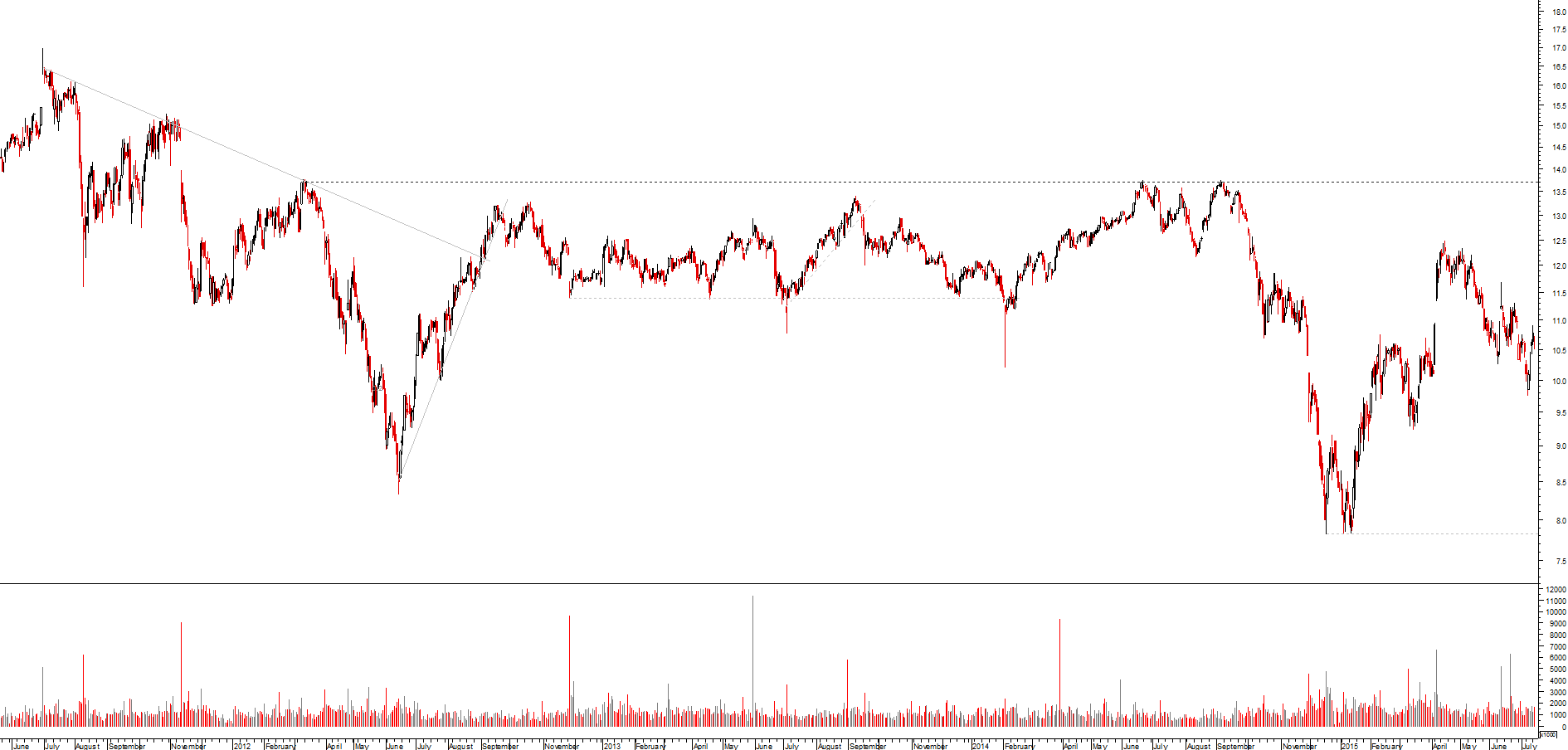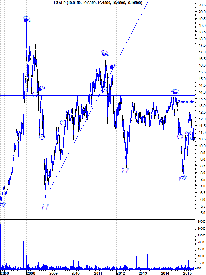 Coloquei no gráfico uma linha "inferior" para balizar aquilo que considero ser a zona de suporte. A Galp está ali num io-io, esperando os touros que não parta e que aquele suporte aguente. Caso contrário, há bastante espaço para cair.
