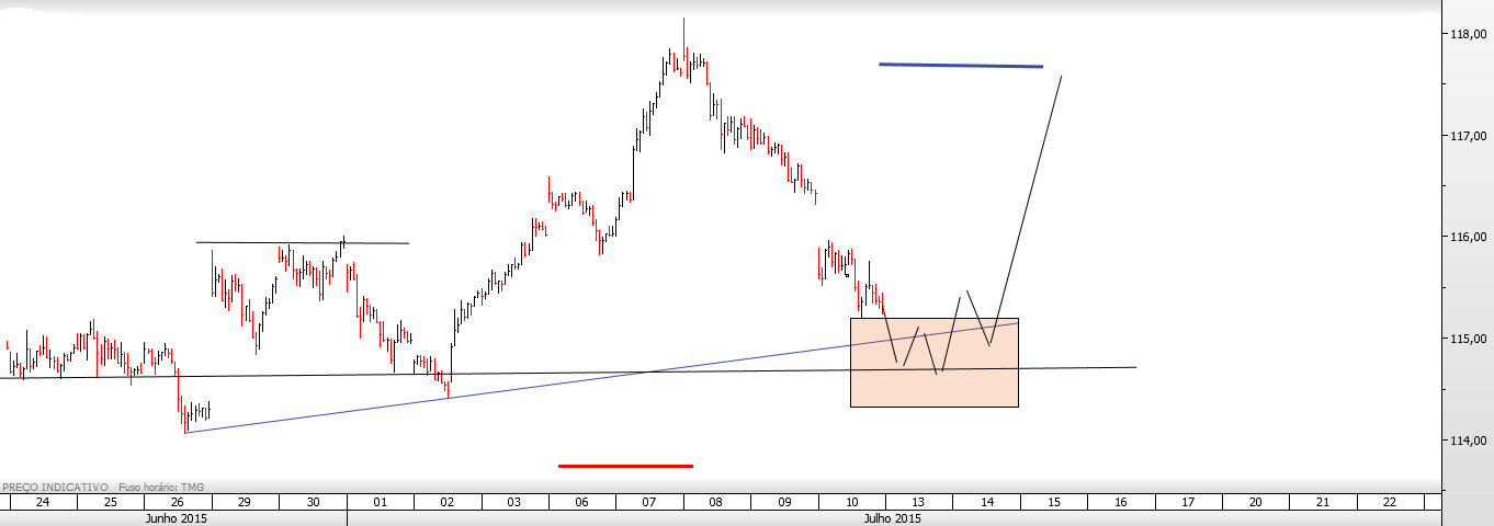 Delineando uma oportunidade especulativa: compra na caixa se o preço aí chegar e estancar por um período de tempo razoável, stop abaixo do pivot em medida equivalente ao atr deste timeframe e target no último high. Técnica: triplo fundo.