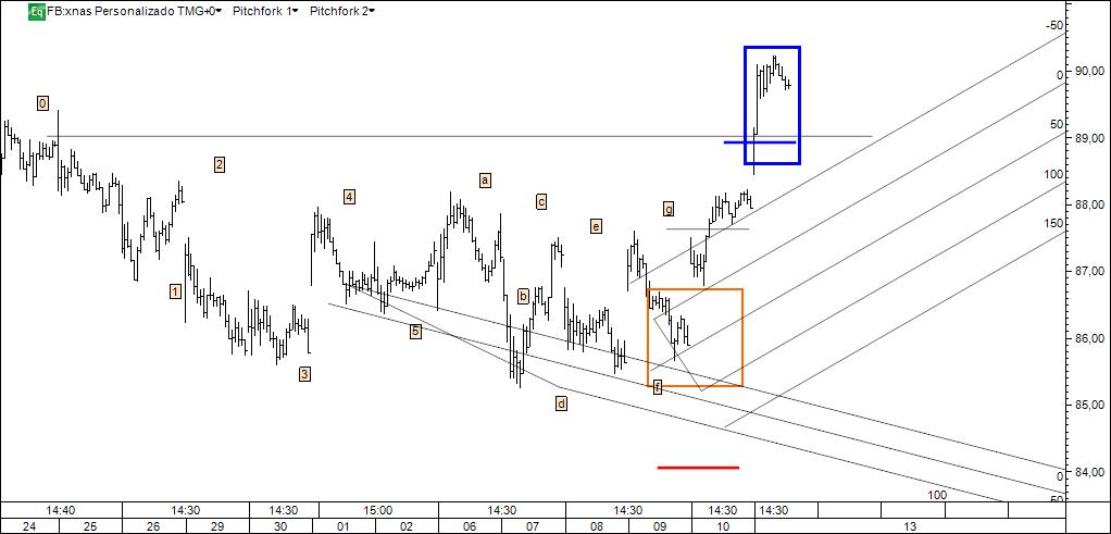 stop acima do último máximo absoluto do gráfico/take profit intermédio a considerar em eventual toque na linha de pivots e/ou lmlh da fork ascendente.