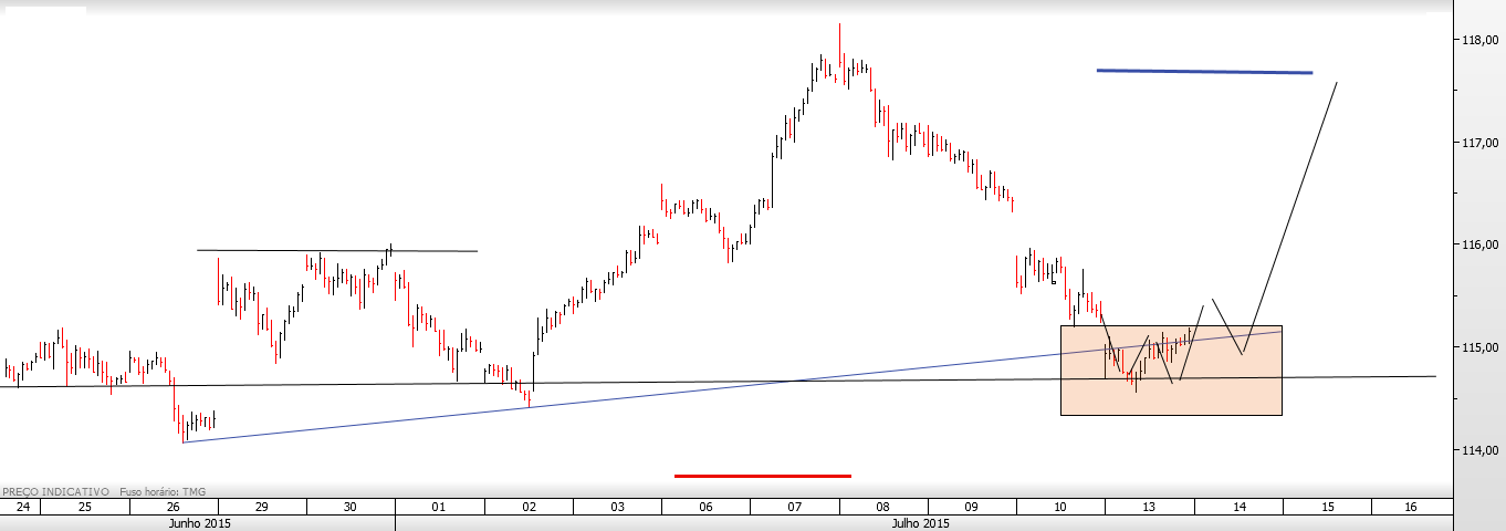 O Alquimista Escreveu:Delineando uma oportunidade especulativa: compra na caixa se o preço aí chegar e estancar por um período de tempo razoável, stop abaixo do pivot em medida equivalente ao atr deste timeframe e target no último high. Técnica: triplo fundo.