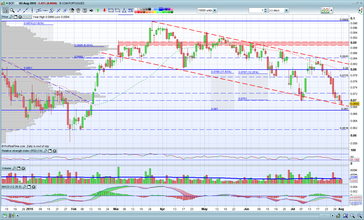 Essas duas linhas estão um bocado "tortas"... a superior não toca em todos os topos, a inferior corta o último fundo. Ainda Assim não quero com isto dizer que o BCP vai cair mais, está a reagir ao suporte e pode até ficar-se por aqui, pelo menos por agora, não estou a ver nos 7 cêntimos a força compradora que se viu na última vez que visitou este nível. Quererá isto dizer alguma coisa? Não sei, veremos... como já disse, a tomar algum tipo de posições, parece-me que em torno dos 7 cêntimos faz algum sentido. Posições longas acima dos 7 cêntimos com um stop abaixo dos 6,80/90, posições curtas caso quebre esta zona em fecho, com stop um pouco acima dos 7... eu, como só me posiciono do lado longo e raramente em títulos com tendência de queda, resta-me ficar de fora a ver!