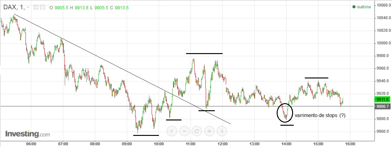 Sobre os vários gráficos que se têm feito aqui do DAX convém ter cuidado com as diferentes escalas temporais para que o pensamento diário não inquine o pensamento no gráfico intradiário e vice versa.