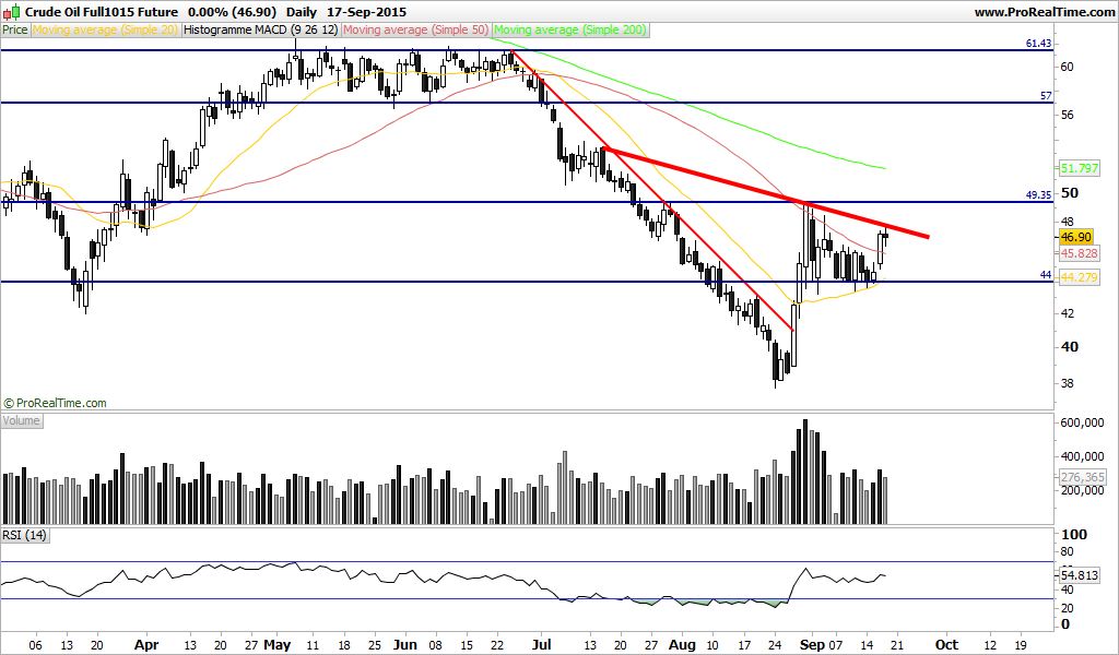 Hoje já cota os 46usd no contrato de Nov. e nesta altura nem é bom entrar longo nem curto. Se no final do dia corrigir para perto dos 44,45-44,8 é de entrar longo. Caso venha abaixo disso com o fecho semanal abaixo disso é provável que o caminho esteja depois bom para curtos.