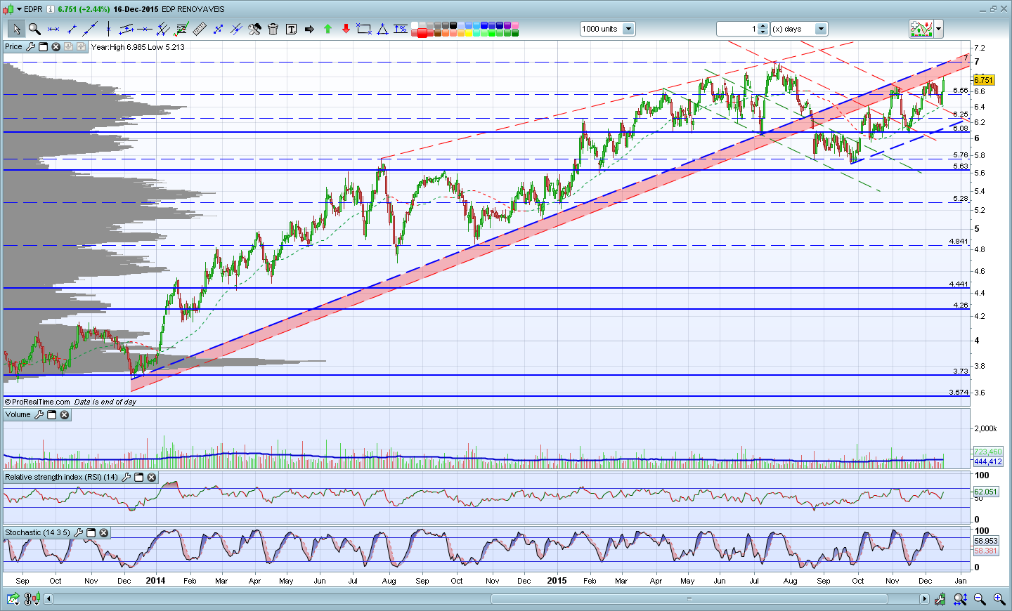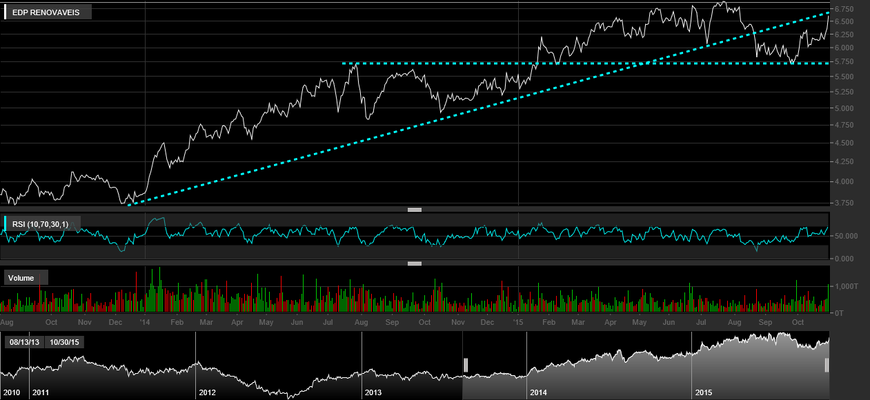 O que posso concluir segundo o meu gráfico é que a EDPr encontrasse perto duma resistência obliqua que pode fazer com que o preço vá para a casa de partida (6,0x) no curto prazo. Estamos também muito perto duma resistência de curto prazo (7) que penso que pode ser visitada brevemente e temos os indicadores a entrar em sobre-comprado.
