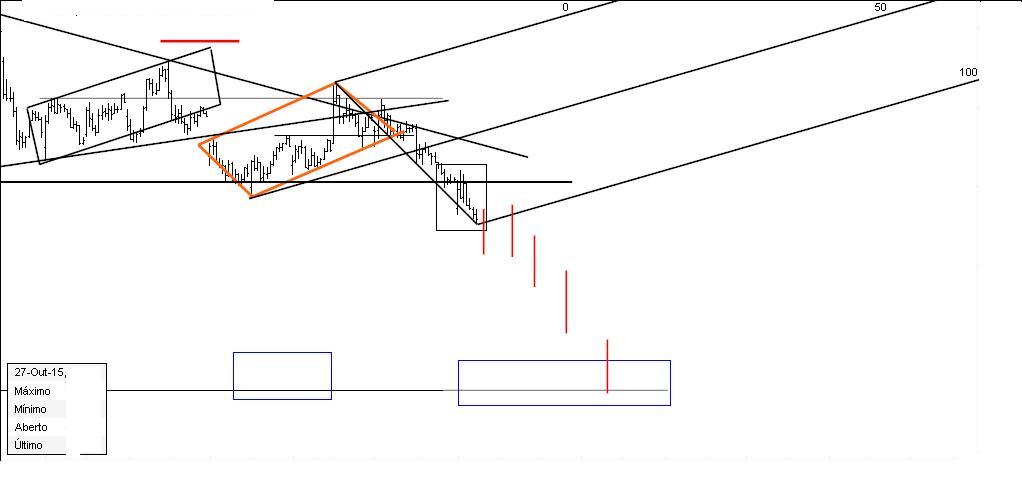 Quanto a este último exemplo, gráfico colocado aqui, deixo o gráfico atualizado. Estava, mais ou menos claro, que o preço iria mais abaixo porque já tinhamos um topo mais baixo, além disso a linha ascendente dos 161,8 mostrava fraqueza.