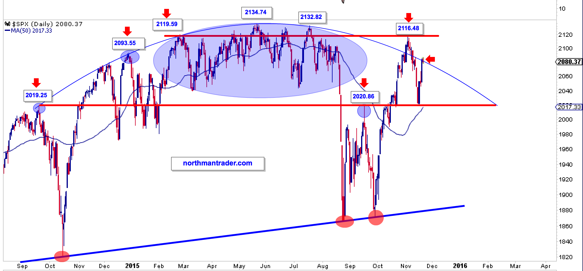 Há uma coisa que me está a intrigar que tem a ver com este arredondamento que é visível nesse gráfico, mas essencialmente com o arredondamento no semanal. Ou este arredondamento acaba com uma vela a furar de forma clara essa zona entre os 2090/2115 ou a probabilidade de a barraca abanar pode ser considerável.