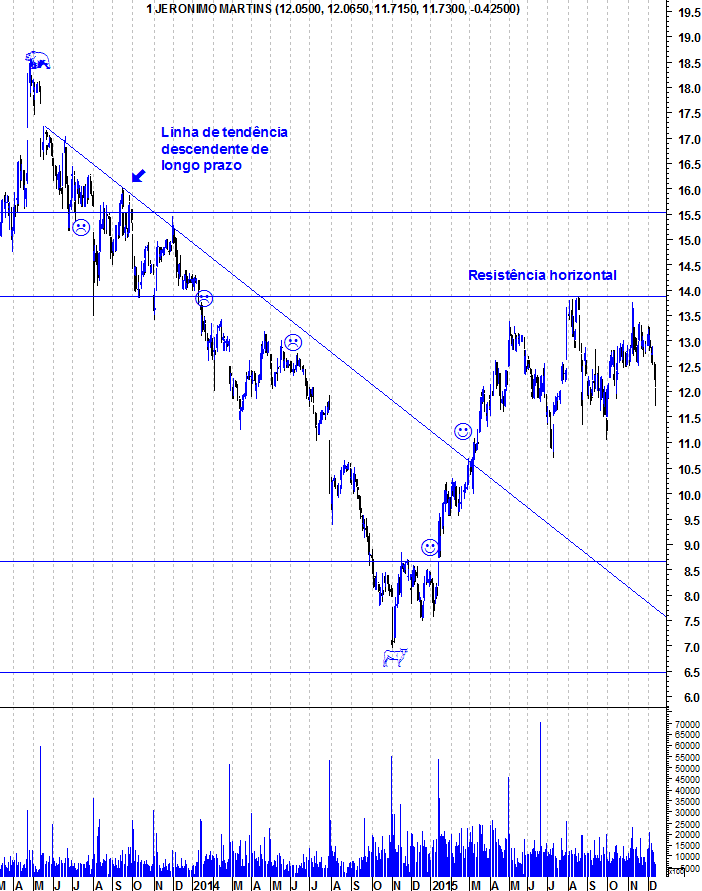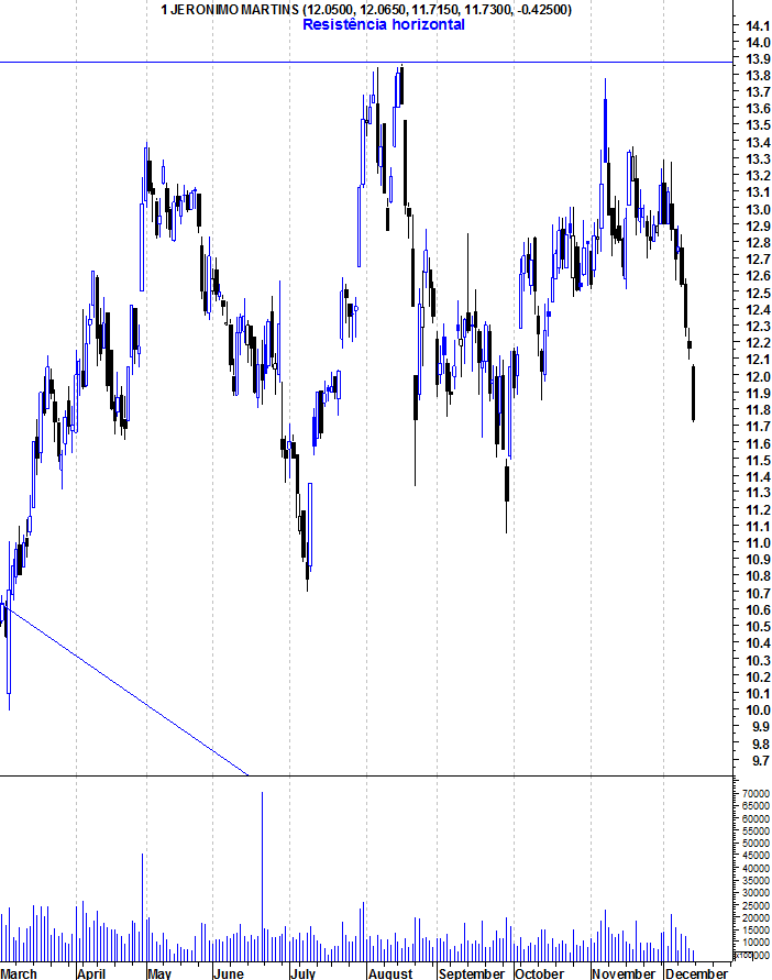 A JM voltou a não conseguir superar a importantíssima resistência na zona dos 13,9 euros. Face à velocidade das quedas desta semana, um ressalto na próxima semana é provável mas quem está de fora deve esperar pela quebra da resistência como sinal de força.