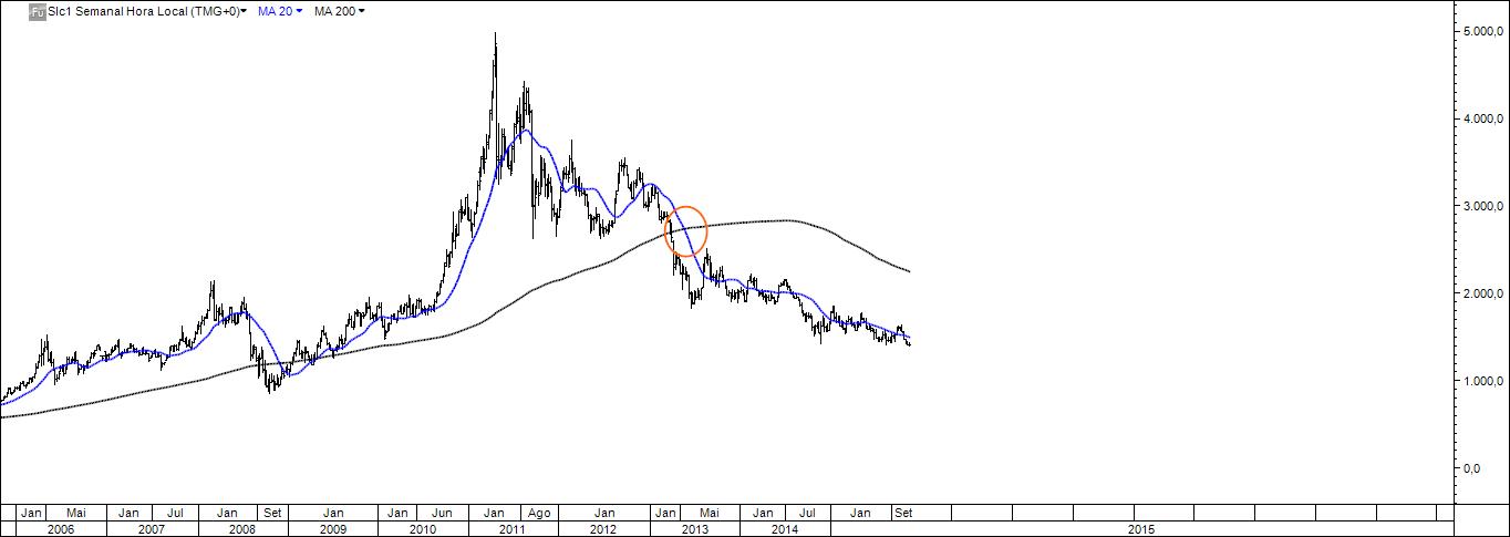 Corroboro a tua opinião segundo a qual os ganhos com um sistema tendencial minimamente afinado são bastante satisfatórios. Na verdade, um simples sistema de trading que use no gráfico semanal o cruzamento das mm 20 e 200 teria entrado curto no crude e na prata e ainda assim estaria. Se olharmos para um gráfico diário do crude, a conclusão seria a mesma, aqui com a vantagem de a entrada vendedora coincidir com a quebra de uma lta (mais uma coisa a favor do negócio). A apple num gráfico semanal é outro exemplo da bondade da técnica do cruzamento 20 x 200, mas neste caso para comprar. Compra essa que, curiosamente, ainda estaria na carteira.