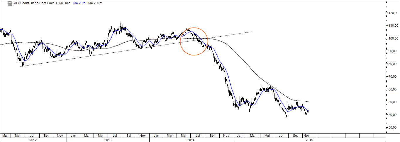 Corroboro a tua opinião segundo a qual os ganhos com um sistema tendencial minimamente afinado são bastante satisfatórios. Na verdade, um simples sistema de trading que use no gráfico semanal o cruzamento das mm 20 e 200 teria entrado curto no crude e na prata e ainda assim estaria. Se olharmos para um gráfico diário do crude, a conclusão seria a mesma, aqui com a vantagem de a entrada vendedora coincidir com a quebra de uma lta (mais uma coisa a favor do negócio). A apple num gráfico semanal é outro exemplo da bondade da técnica do cruzamento 20 x 200, mas neste caso para comprar. Compra essa que, curiosamente, ainda estaria na carteira.