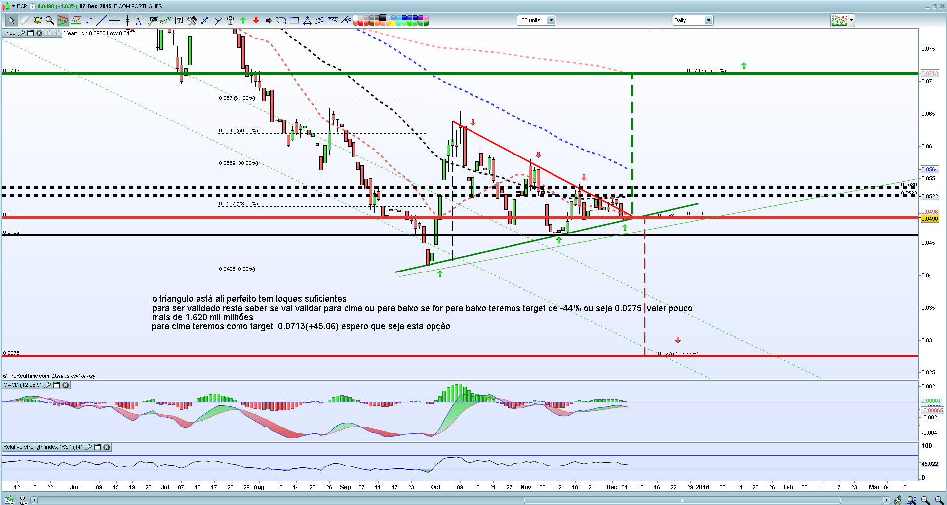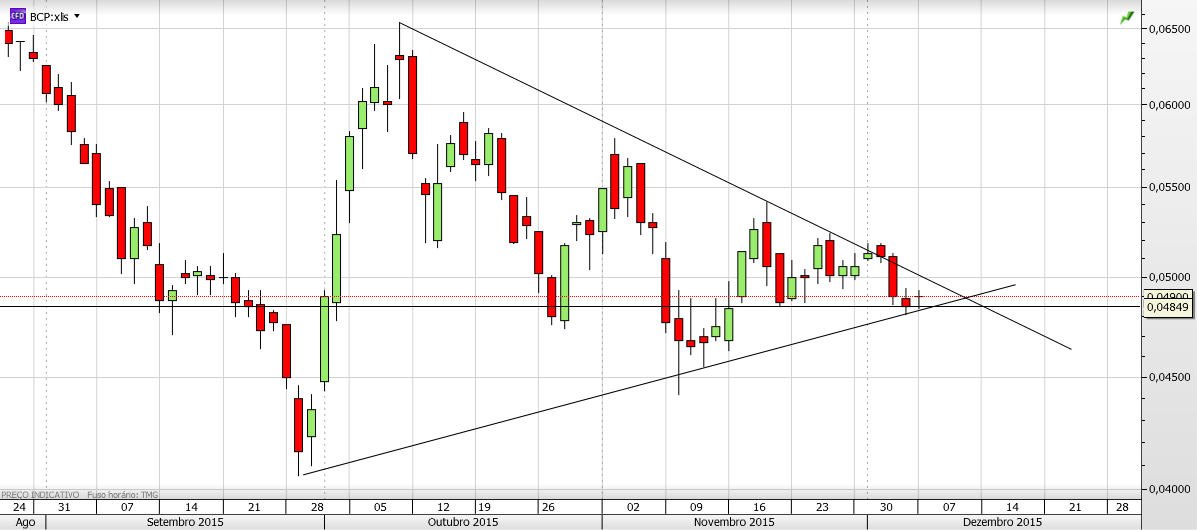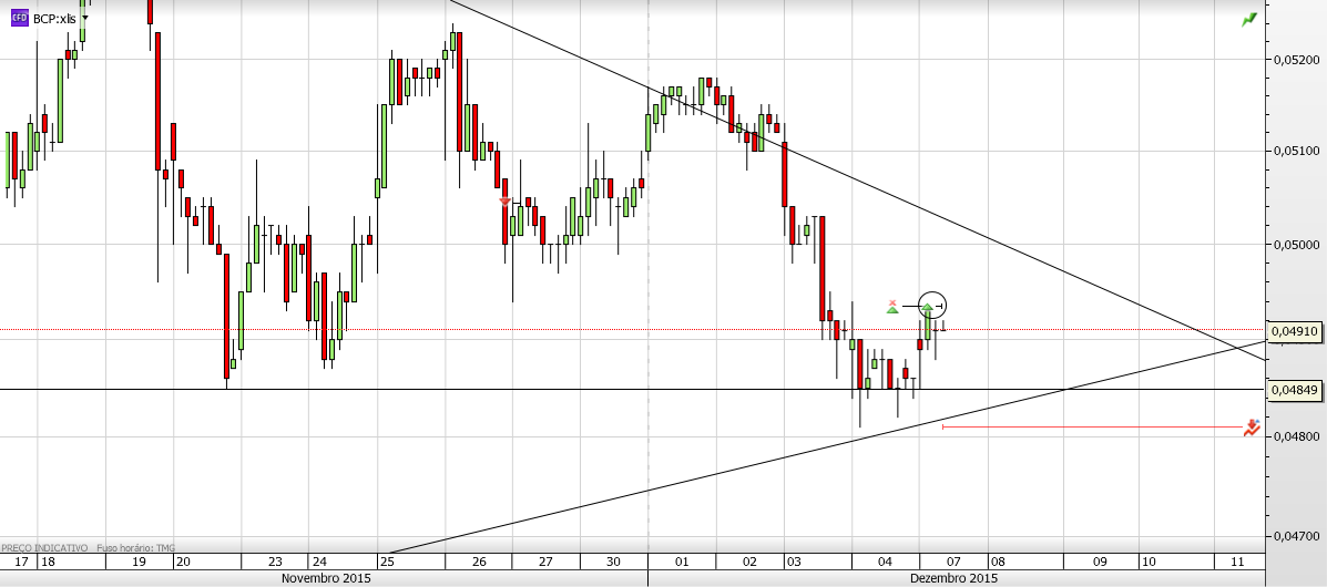 A situação técnica do bcp a 1h não está favorável a subidas. Desde o dia 19/11 até dia 2/12 andou em consolidação, a qual foi rompida para sul nos dias 3 e 4/12.