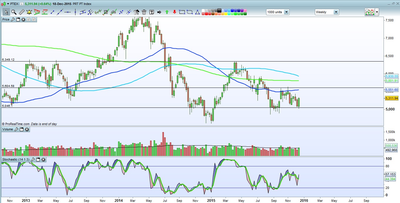 Cenário optimista: O PSI20 apoiou-se num padrão de inversão no gráfico horário para gerar um movimento ascendente de curto prazo no gráfico diário, estando agora prestes a retestar a zona do anterior máximo relativo. É, para já, esse o grande objectivo imediato. A quebra dos 5400 pontos em alta, seguida de uma retracção que se ficasse acima dos 5145 pontos, representaria uma alteração de tendência de médio prazo que poderia traduzir-se num rally um pouco mais prolongado em inícios de 2016.