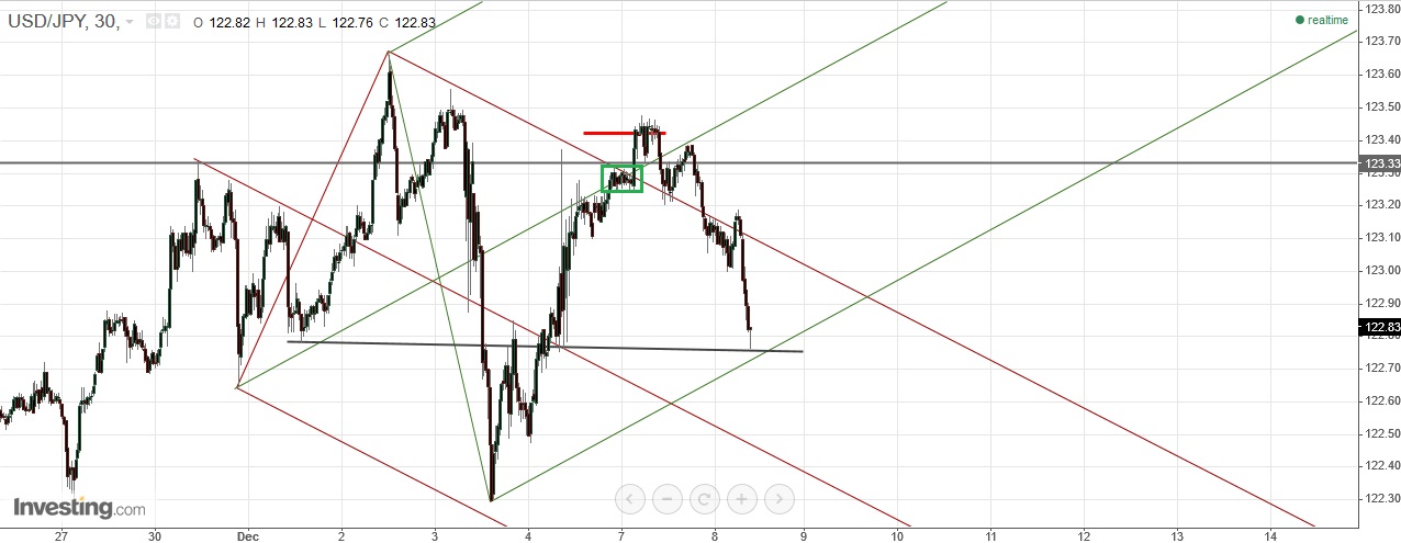 malvoisin Escreveu:após os 2 últimos negócios que aqui postei, curto no usd/jpy e longo no eur/usd, em relação aos quais detectei erros na sua definição, por ex. no caso do usd/jpy, no qual shortei uma intersecção de linhas mas cuja stop -loss tinha em vista um gap que ficava bastante acima dessa intersecção, decidi fazer uma pausa, e voltei com esta entrada curta num câmbio. a stop está próxima (protegida pelo alfinete), as linhas pareceram-me aprazíveis, o target ainda não está definido, embora esteja de olho na lmlh da fork descendente - pela quantidade de toques, parece-me significativa.