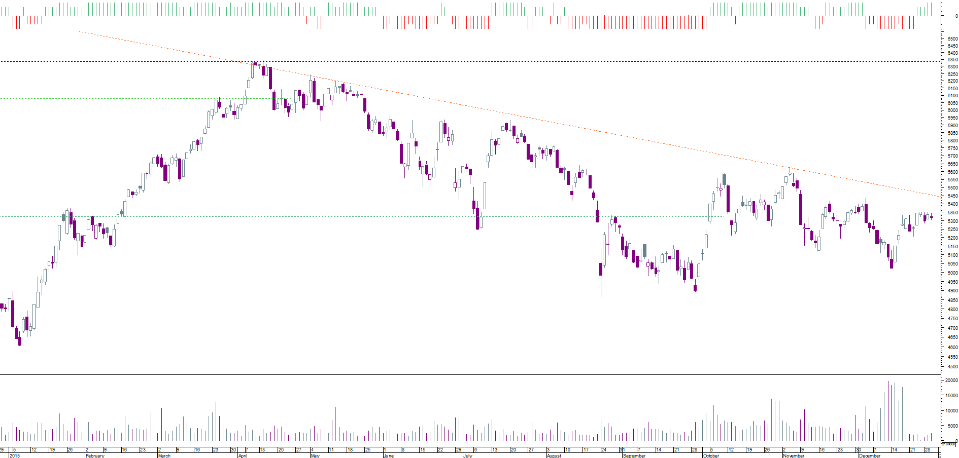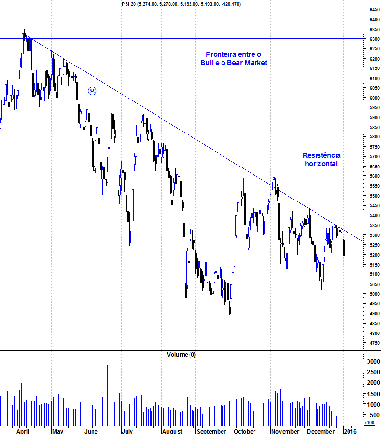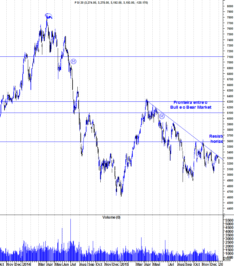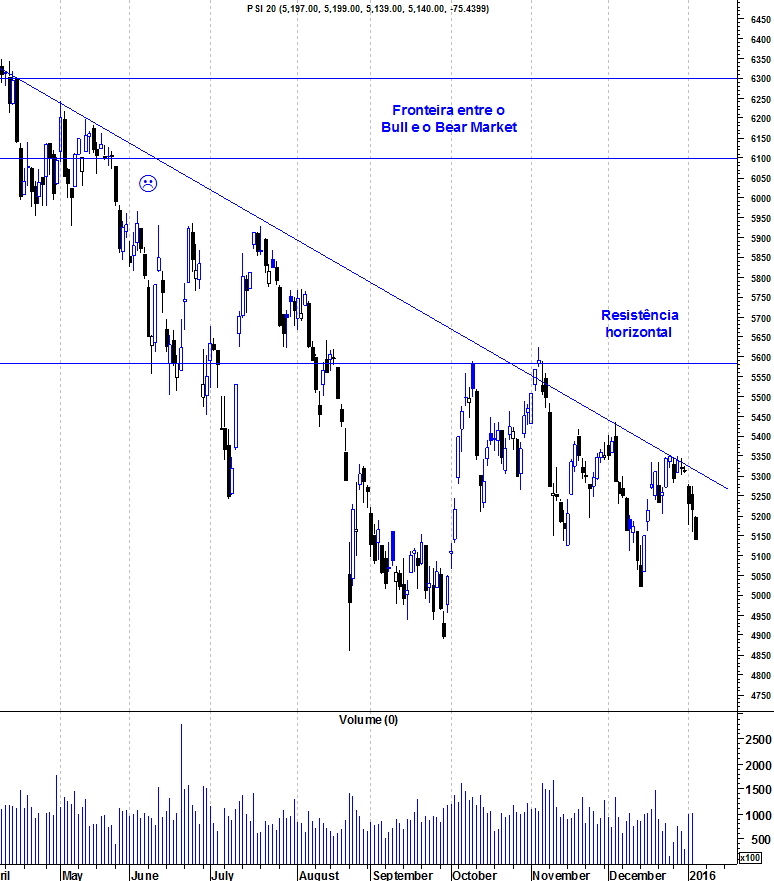 O ano começa sem alteração da tendência vigente. O PSI continua a fraquejar nas alturas em que dá alguns sinais de esperança. Continua sem dar os decisivos sinais de força que me façam despir o meu fato de urso. Continua sem quebrar a LT descendente e sem dar o decisivo sinal para o curto/médio prazo que seria a ruptura da resistência dos 5600 pontos.