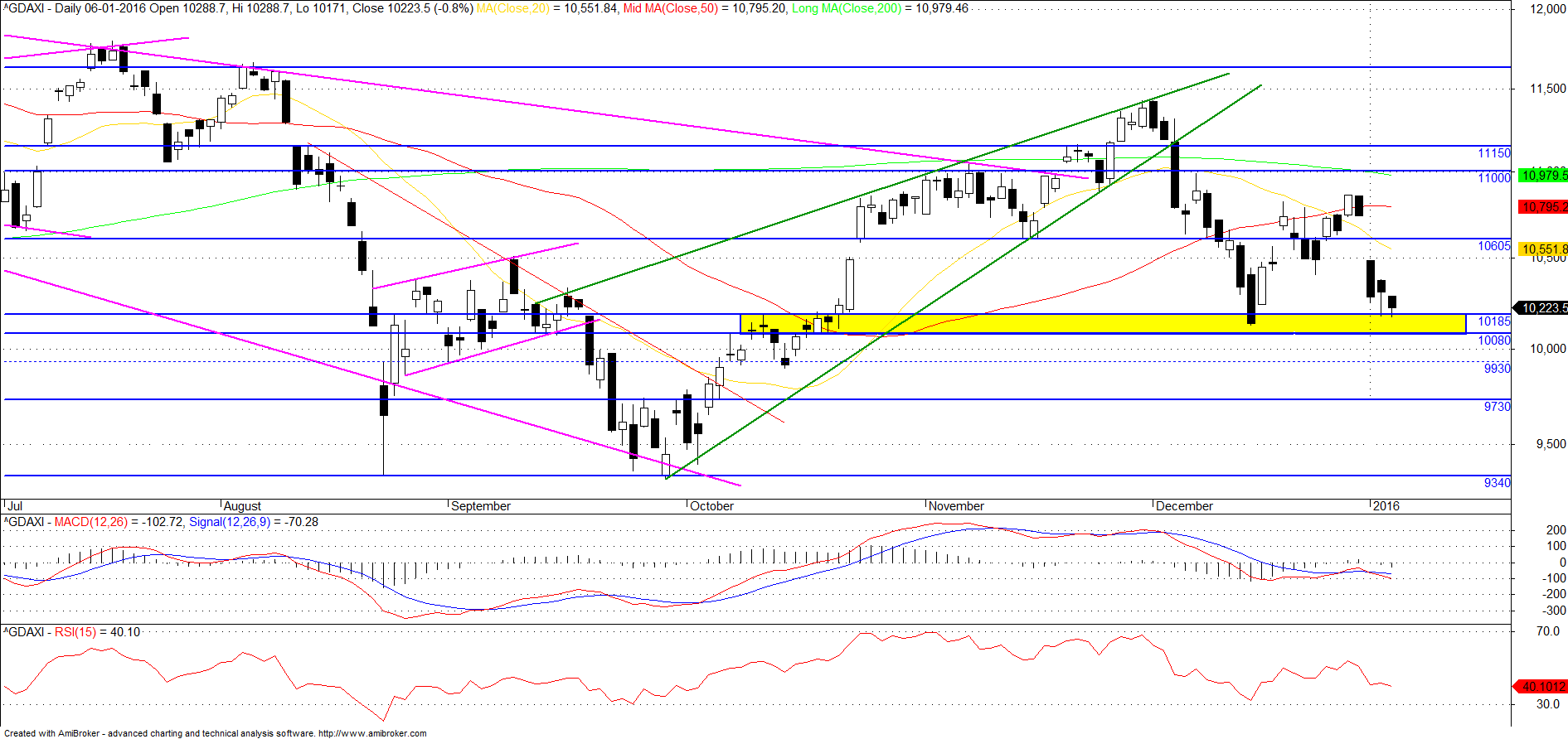 Presumo que após a abertura, dada a volatilidade, deverá haver uma tentativa de subida sem fazer higher highs. Se acontecer, aproveitar para meter curto. Se após abertura, o Dax for por aí abaixo tout court, sair após fazer lower low pois vai haver tentativa de recuperação.