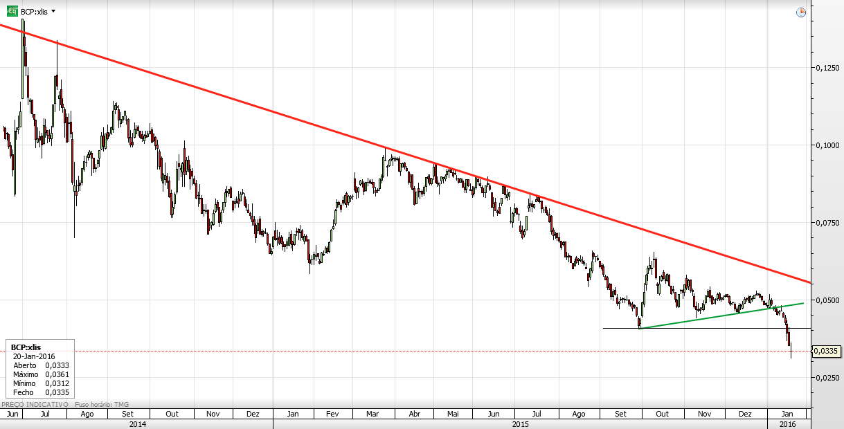 Eu nunca entraria no bcp mas, para quem tem posições, hoje temos uma vela que PODERÁ ser de inversão ( de tendencia descendente para ascendente) no curtissimo prazo. Basicamente até conto com um ressalto!