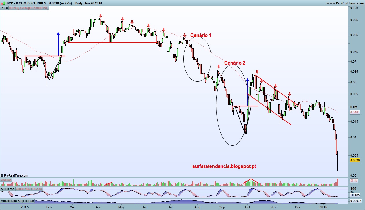 No gráfico diário, como já referi, a inversão consumou-se em Junho de 2015. A partir desse ponto tem vindo a acentuar-se a queda, com três rallies descendentes especialmente bem marcados no gráfico. Olhando para os dois primeiros, podemos especular o próximo passo do título após terminar o actual. Ou segue uma trajectória semelhante à do cenário 1, de discreto ressalto seguido de novas quedas, ou um cenário próximo do 2, de forte ressalto. Para já, não é possível vermos qual dos dois é mais provável. Sendo o segundo o mais atractivo, haverá certamente pistas prévias à sua ocorrência. Não é, no entanto, ainda o caso. Não há suportes nem pontos de referência próximos (o mais próximo está nos 5,21 cêntimos). Para se consumar uma inversão, terá ainda de ser criado um novo lower-high e depois quebrado em alta.