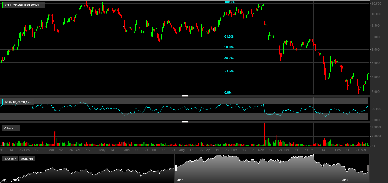 O nosso psi coxo vive uma realocação de carteiras, no caso dos CTT, tem cumprido bem tecnicamente e a aceleração as vendas era mais que expectável depois dos máximos terem explodido por exaustão. Agora é preciso ter atenção com qualquer suporte desta cotada porque para além da sua 'frescura', o bear está à vista de todos e os suportes valem o que valem. (imaginem se tivessem de vender centenas de milhares de acções discretamente num papel em queda... os suportes são oportunidades!)