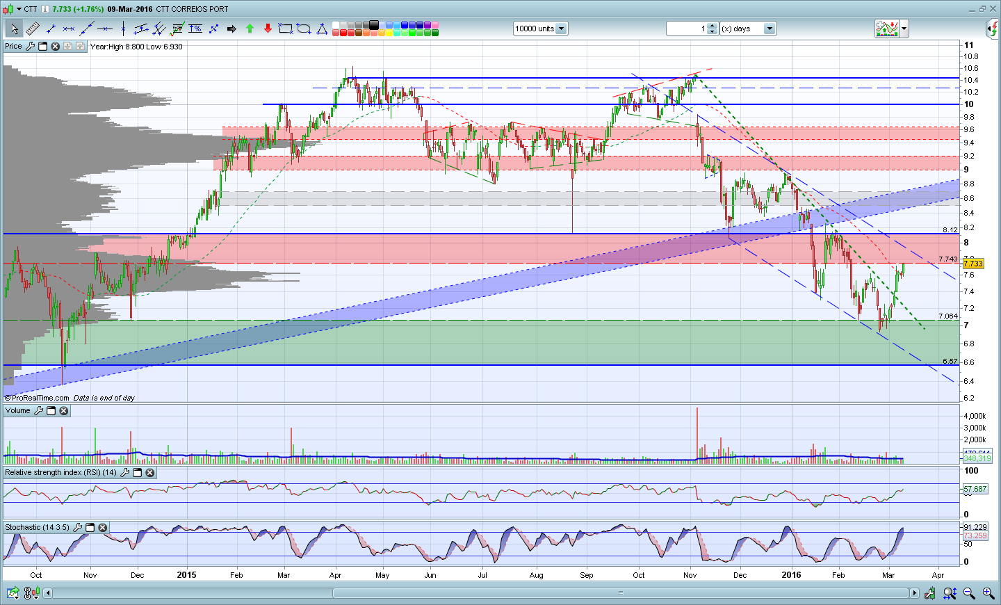 tiagopt2 Escreveu:Apesar do bom momento no curto prazo, as coisas não estão fáceis para os CTT. Desde a quebra do importante suporte nos 8,8€, que eu tinha já assinalado na última análise como sendo decisivo para o título no médio prazo, a quebra intensificou-se e atingiu já os 30% desde máximos. Muito significativo, se considerarmos que os CTT são um título relativamente defensivo. Neste movimento, desenhou uma linha de tendência de validade moderada. Atente-se contudo à angulação da mesma, que por ser muito pronunciada não deve ser tida em grande consideração. A sua quebra em alta representará, em teoria, pouco mais do que uma diminuição da velocidade de queda. Numa óptica de médio prazo, mais importante que a quebra em alta desta linha, será sem dúvida a superação dos 8,12€. Será esse o ponto que marca a fronteira entre o bear e o bull mode.